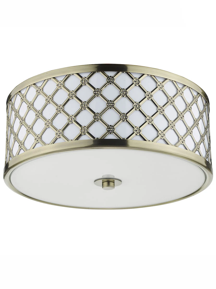 Crafted by Dar with timeless detailing, the Civic flush features fretwork outer frame with frosted glass inner and opaque glass diffuser for soft comfortable lighting. Available in antique brass or polished chrome finishes. Dimmable for mood lighting. Requires 2 x E14 bulbs (not included, LED recommended).