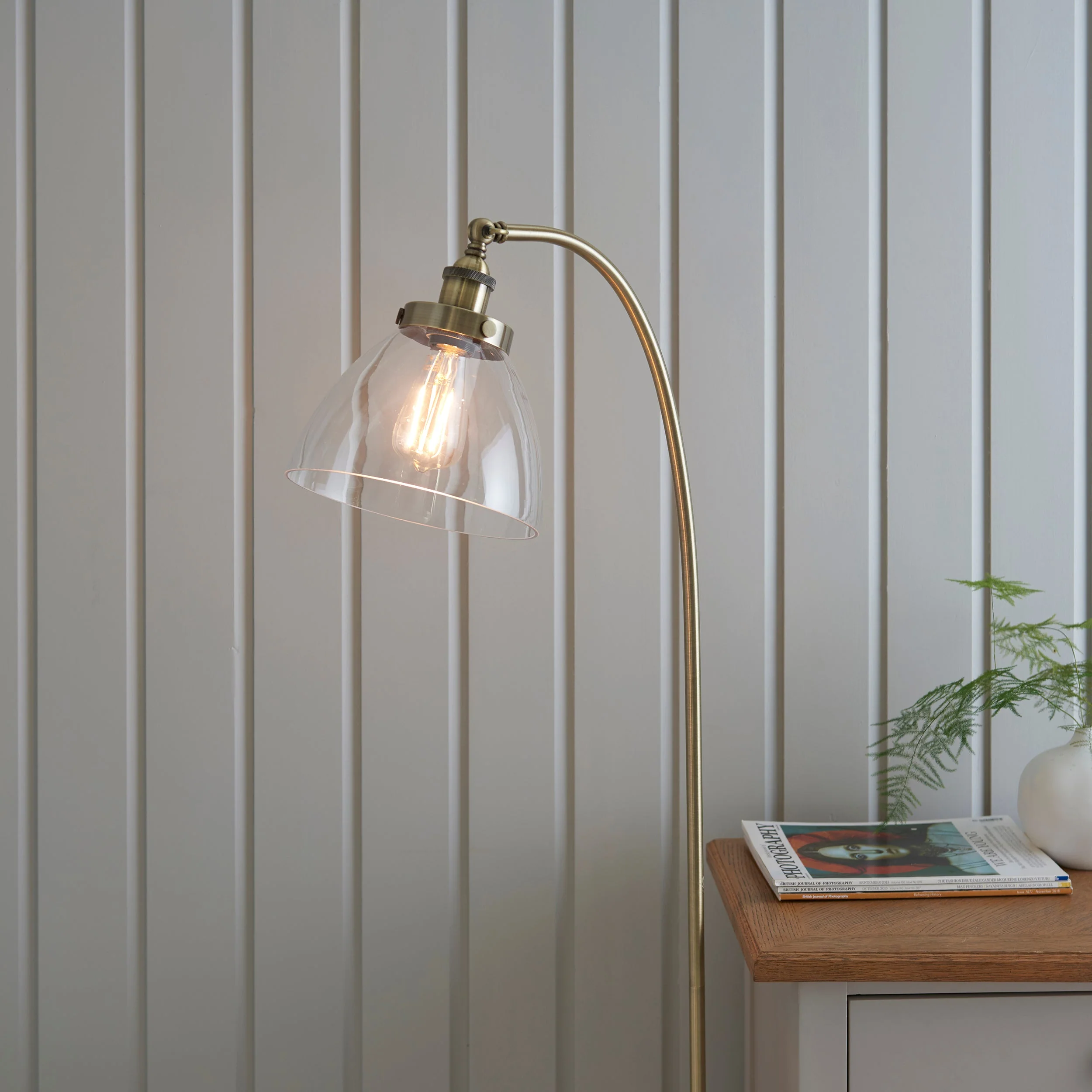 An authentic 'resto' style adjustable floor lamp, finished in antique brass plating with authentic knurled lamp holder details and clear glass shades. Featuring an adjustable knuckle and accessible on/off switch, pair this table light with filament LED lamps for that perfect industrial style. The perfect addition for today's stylish homes to create that on trend bar, bistro look. ,