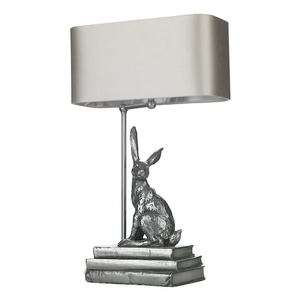 The David Hunt Hopper table lamp featuring our favourite little hare, in our pewter resin finish with matching metalwork and coordinating braided cable. Shown with optional Zoffany rounded rectangular shade in Satin Cloud with Silver Lining.