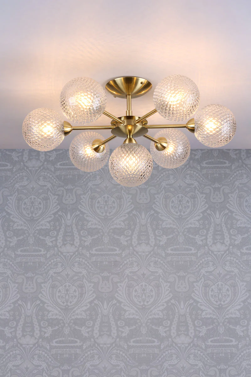 Crafted by Laura Ashley with attention to both form and function, the Atherton semi-flush showcases contemporary design with practical glass shades. The clear glass maximizes light output while the satin brass metalwork adds warm contemporary sophistication.