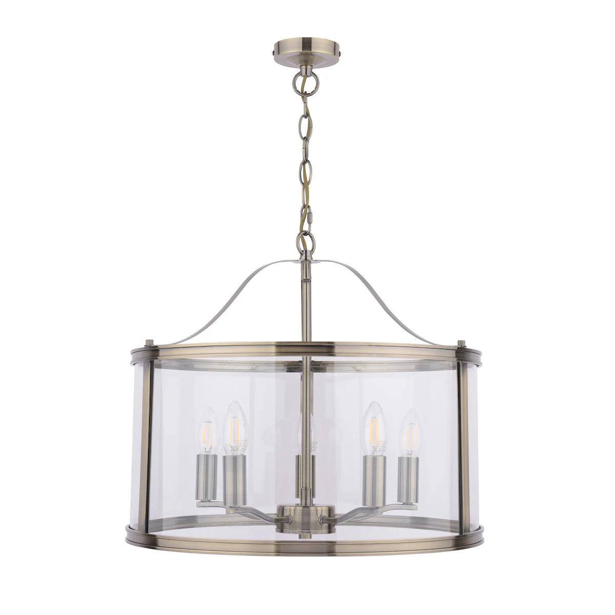 The Harrington 5-light pendant makes a stunning focal point above dining tables where the clear glass creates a bright atmosphere for entertaining, over kitchen islands where it provides practical task lighting with heritage appeal, or in living rooms as a timeless statement piece. The antique brass finish adds warmth and character to traditional and contemporary interiors alike.