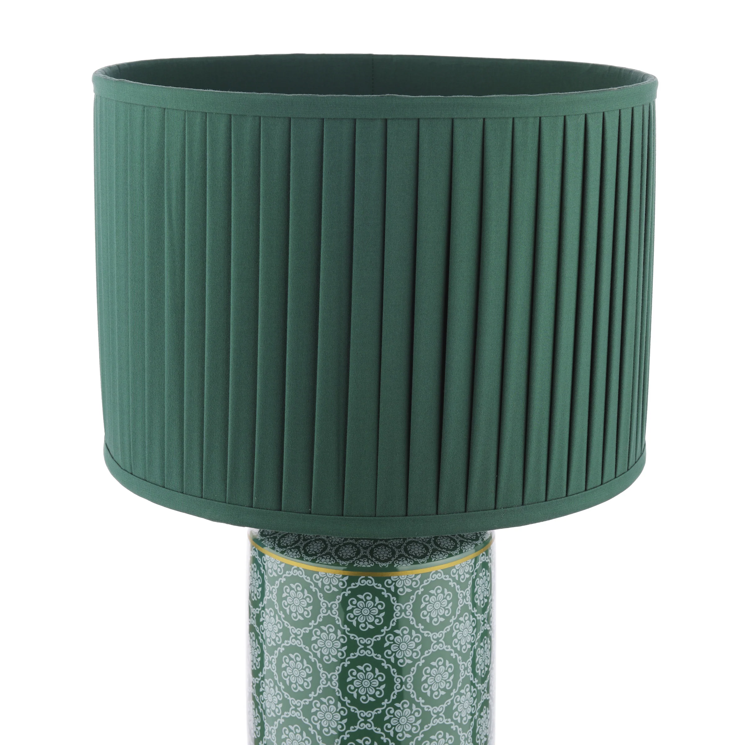 - Deep green faux silk shade – Soft silk shade complements patterned base beautifully, included