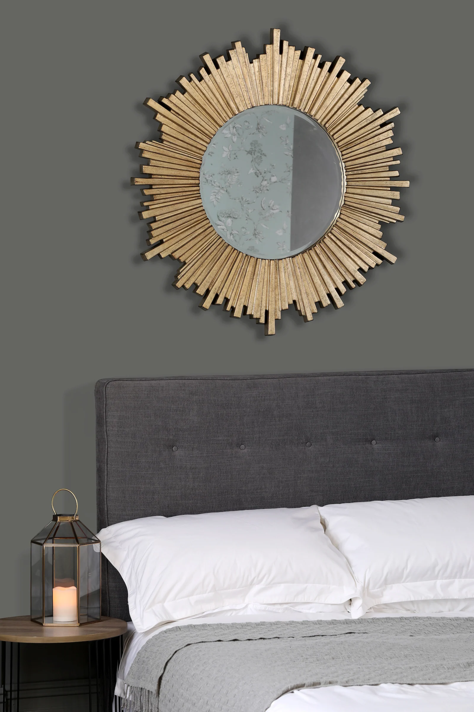 The Lovell round mirror excels in living rooms where the sunburst design creates dramatic focal points, in bedrooms above dressers where the Art Deco styling adds glamorous elegance, or in hallways where the 99cm diameter makes a bold statement. The distressed champagne finish coordinates beautifully with contemporary and glamorous interiors. Not suitable for bathroom or outdoor use.