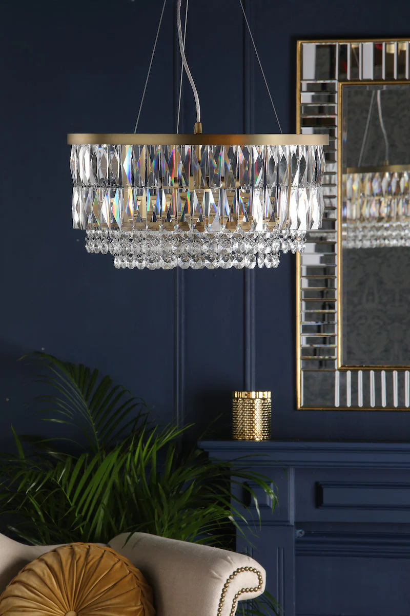 The Laura Ashley Rhosill 4-light grand chandelier brings magnificent elegance with its gracefully curved arms and stunning faceted glass crystals. The matt antique brass finish adds heritage appeal and warmth, while the delicate crystal embellishments create beautiful light dispersion that transforms dining rooms, hallways, and living spaces into refined, sophisticated environments.