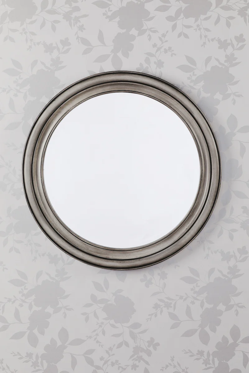 The Laura Ashley Tate mirror brings rustic farmhouse elegance with its beautiful distressed grey wood frame and generous 60cm round proportions. Featuring weathered natural wood with authentic character, this versatile mirror adds light-enhancing warmth and visual impact to living rooms, bedrooms, and hallways, transforming any space with its vintage farmhouse aesthetic.