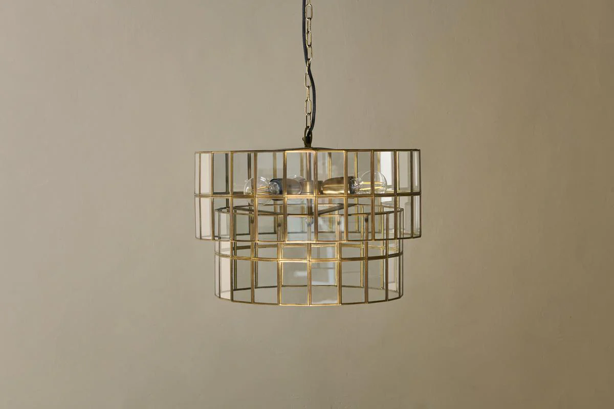 Nkuku have added this stunning two-tier chandelier to their Kirindi lighting range. The unique design features have been carefully chosen to enhance the overall piece. The glass panels have been set within an iron frame that has been given an antique brass finish, with a matching brass bulb holder and hanging chain. This creates a simple yet elegantly versatile design, while the size of the panes and the over-layering effect creates real impact. This Kirindi glass panelled chandelier would look sensational as a pair in a living room, or above a dining table or in a hallway for a striking statement. A Kirindi pendant is also available.