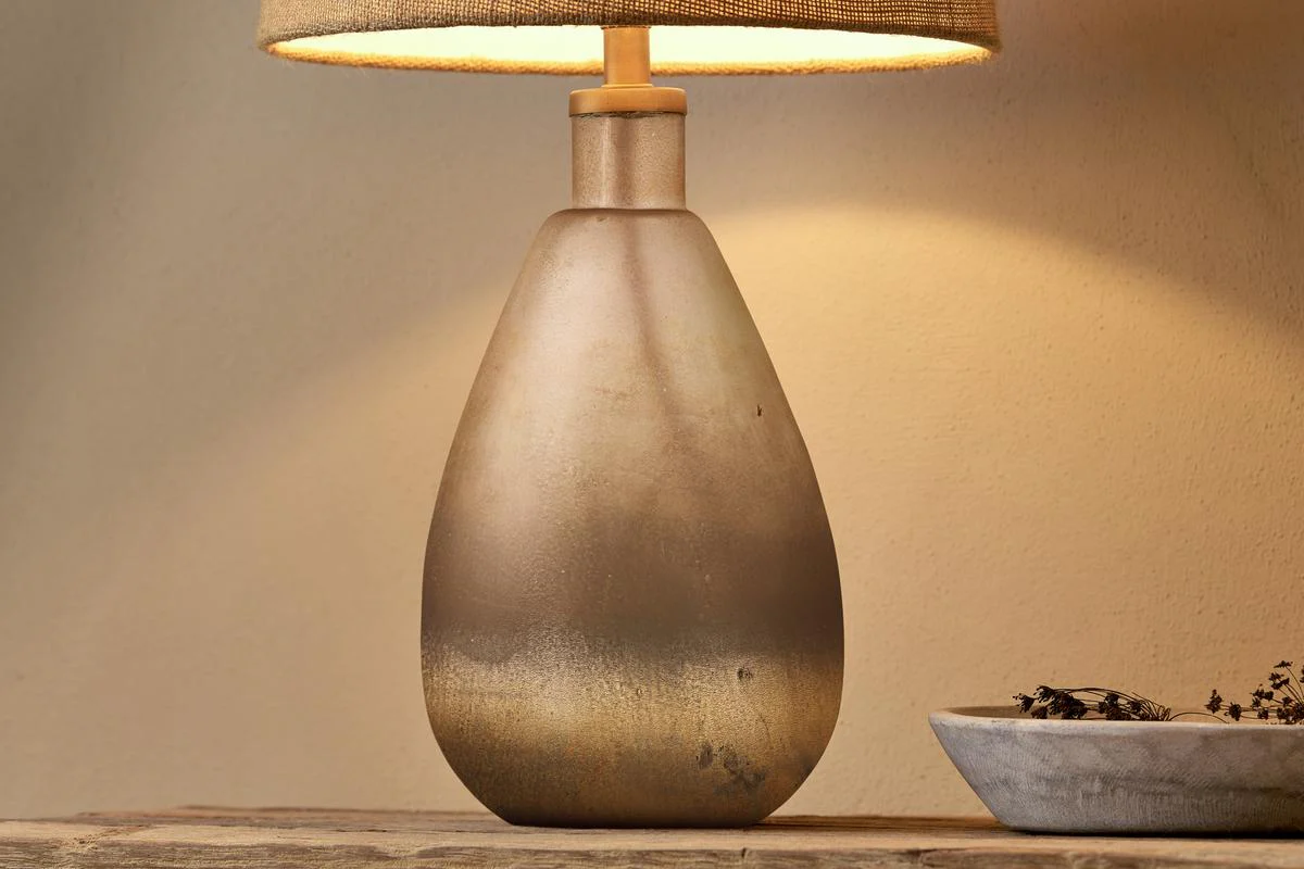 Expertly crafted from mouth blown recycled glass, our Palla Table Lamp is finished with a distinctive rustic smoke antiqued finish. While this is a statement piece, the neutral colours make it versatile and easy to integrate into any home. Pair it with a natural shade to add subtle texture and warmth to your space. This lamp combines form and function effortlessly, providing both functional light and striking style.