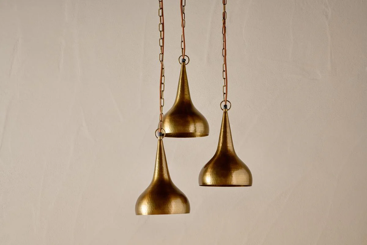 Our Quinn Hammered Metal Cluster Lamp is made from aluminium and finished with a rich antique brass tone. The metal has a characterful textured hammered finish that is carefully created using hand tools. The tone and texture of this statement piece feel authentic and add eye-catching interest to a room.