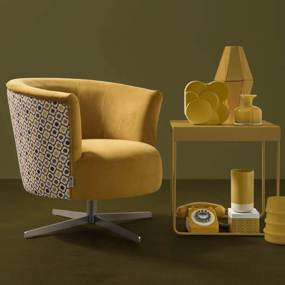 A comfortable and contemporary addition to your living space, the Lily Swivel Chair is small but perfectly formed. Available with a patterned back and plain seat, this stunning design is finished off with a contemporary 4 spoke brushed steel base. This is the perfect piece to add a personal style statement to your home.