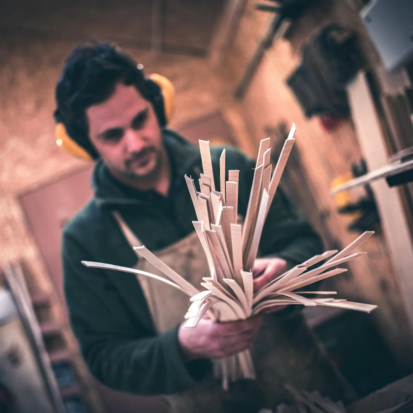 - Hand-cut birch plywood strips – Each piece individually shaped and sanded
