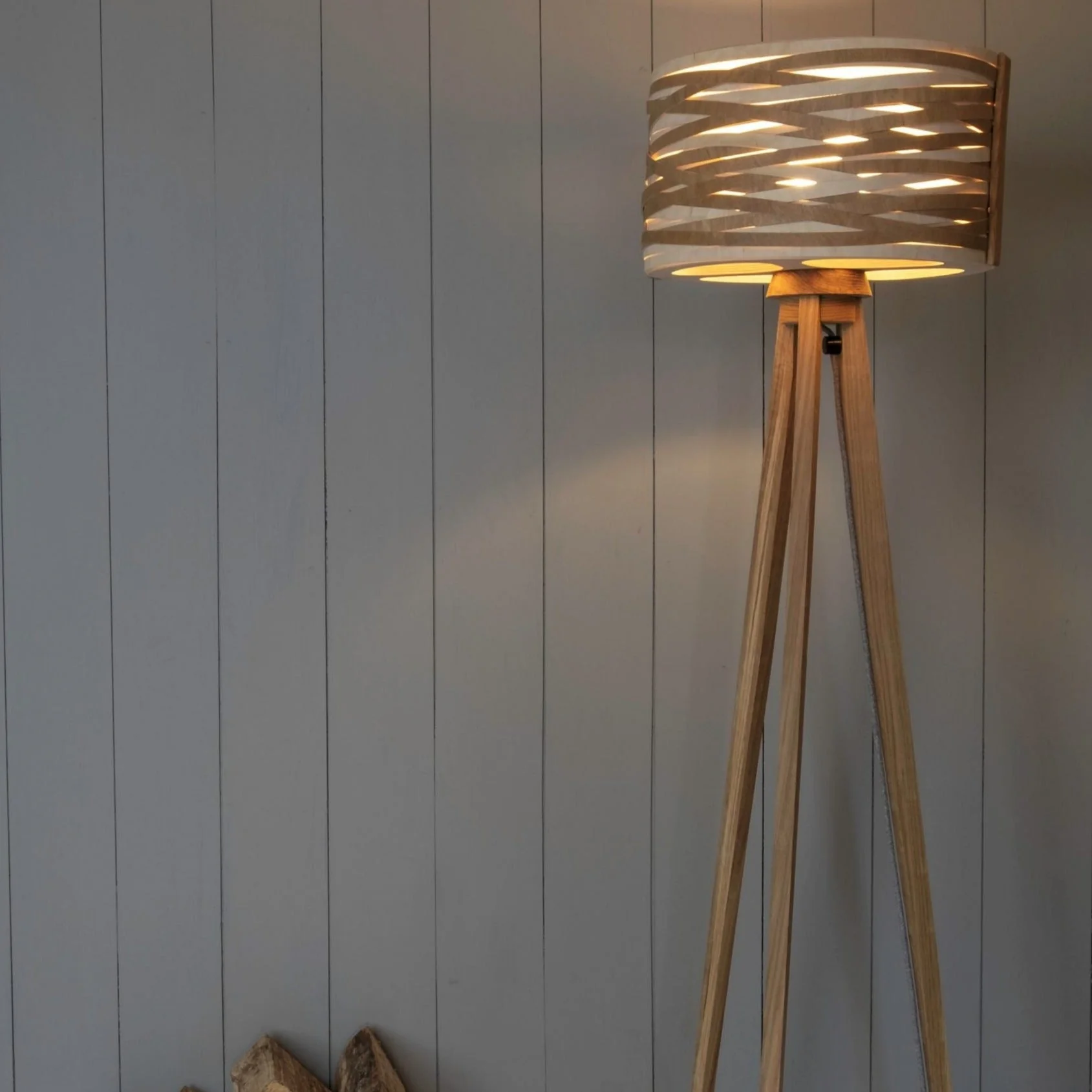 Stuart decided to take the Convolution concept and make a drum shade which sits beautifully onto one of our handmade tripod stands. Its strips are hand-prepared and individually arranged. Darker strips are threaded throughout to give a contrast to the natural birch strips.