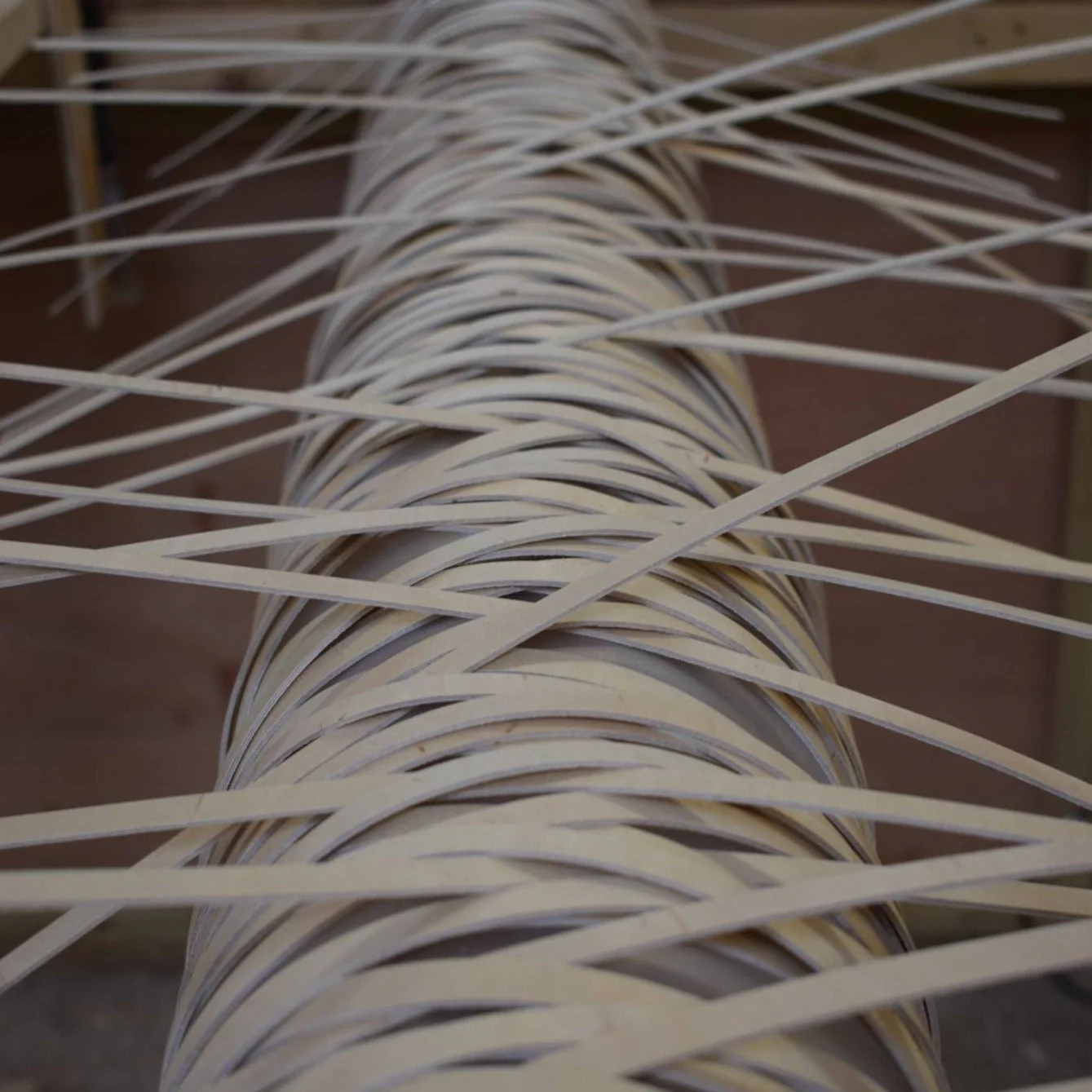- Hand-prepared birch plywood strips – Each piece individually shaped and arranged